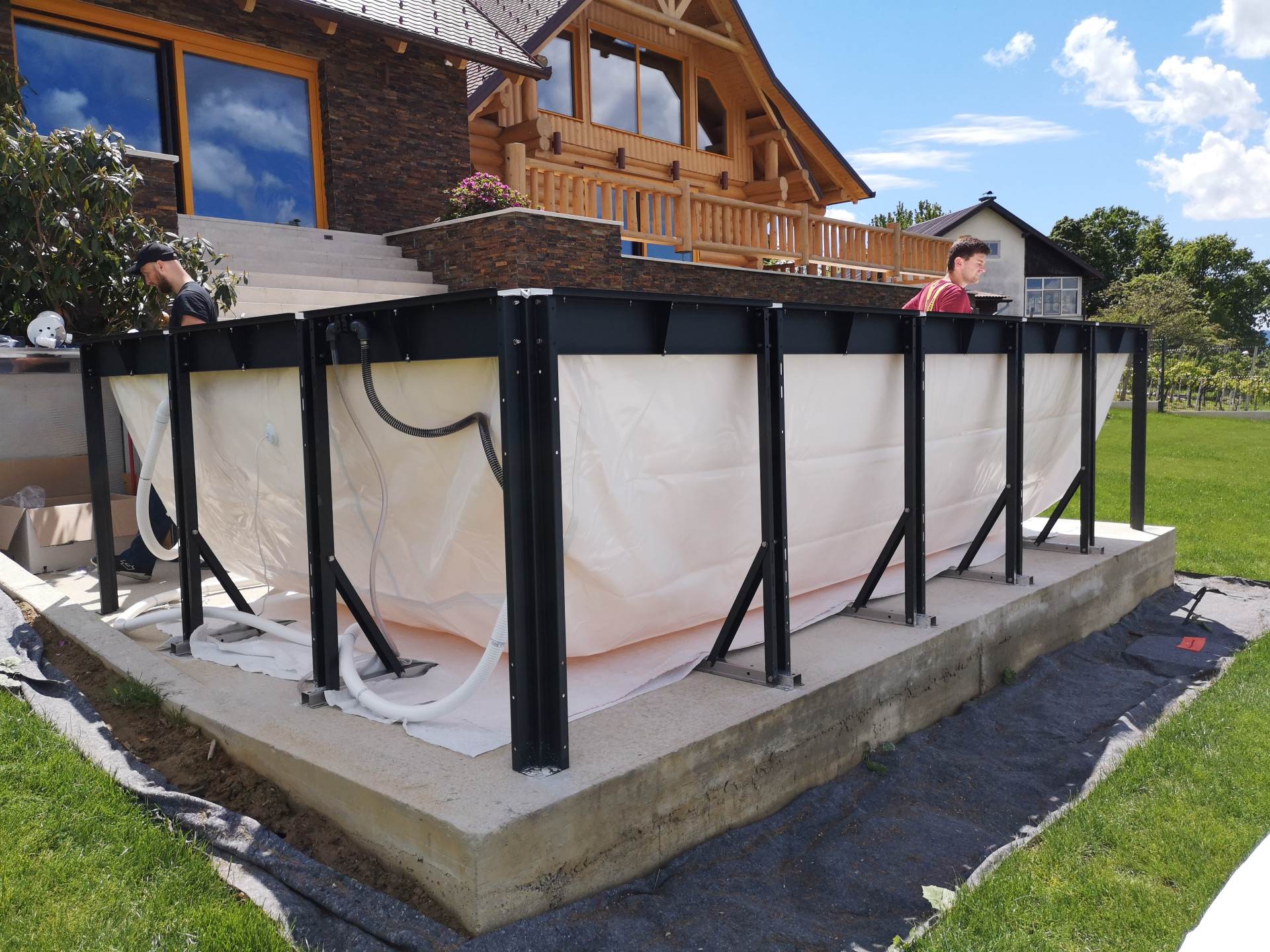 Ako nije moguće izgraditi betonsku ploču moguće je bazen napraviti korištenjem samo metalne konstrukcije bez uporabe betona.